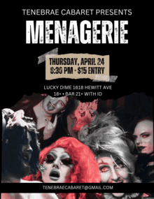 Please save the date for Thursday, April 24th, for an unforgettable evening as the Tenebrae Cabaret presents "Menagerie," a dark drag cabaret show at the Lucky Dime in downtown Everett. Join us for a night of mesmerizing performances in the heart of the city.